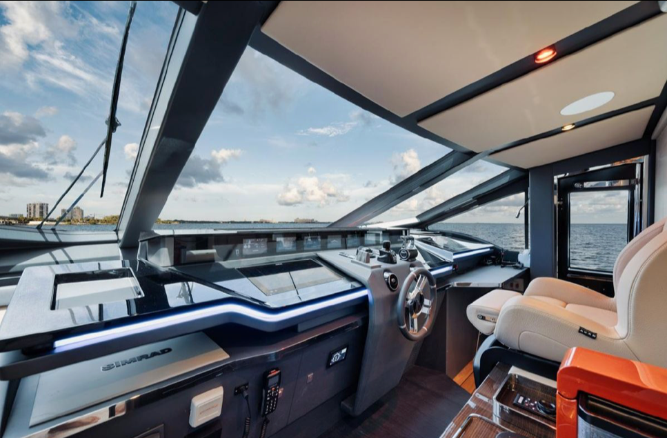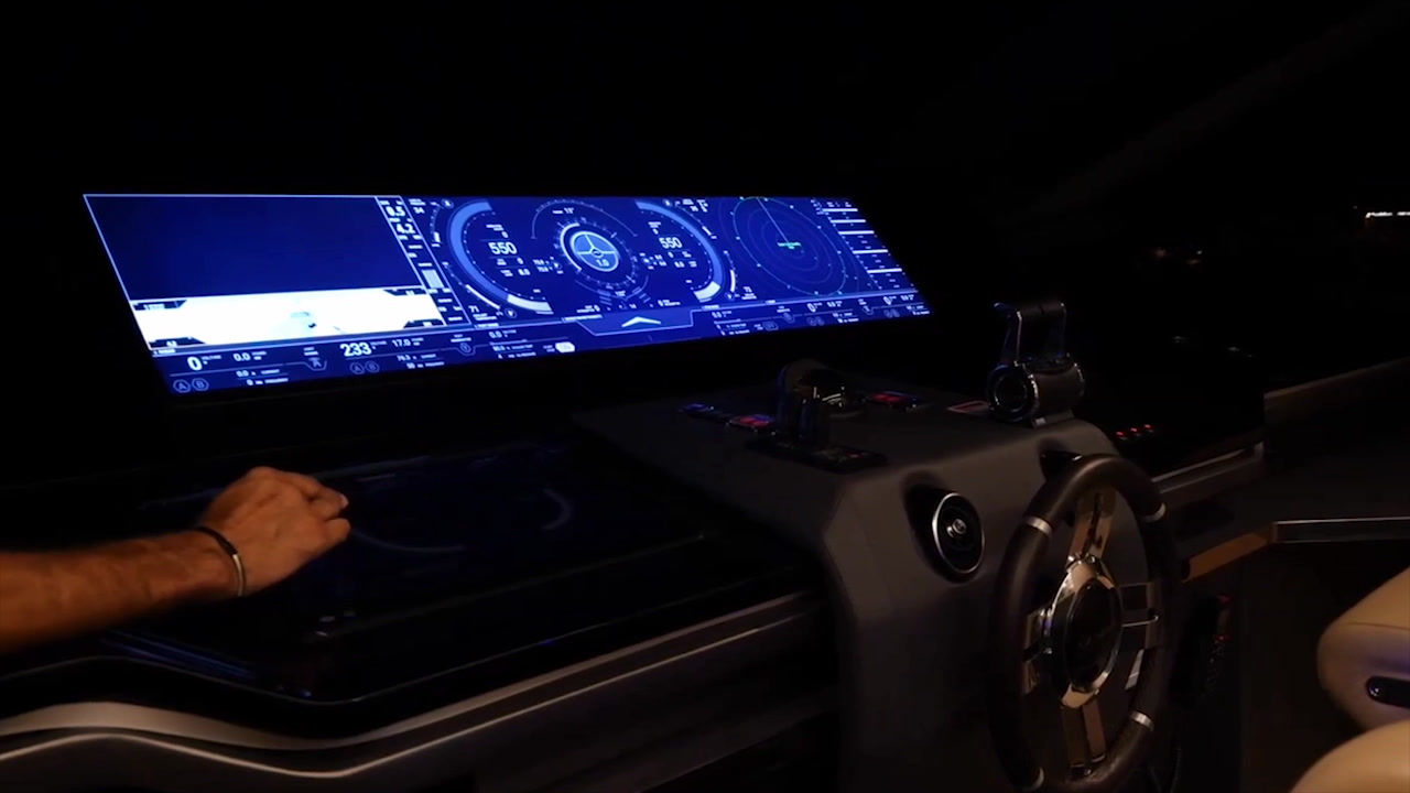 Within the impressive Azimut Grande S10, there is a super-technological control panel specifically developed for this model in collaboration with Navico Group and Davide Cipriani from CENTROSTILEDESIGN. This control panel has the unique feature of offering various monitoring and navigation scenarios, including the ability to display the largest nautical chart ever seen on a yacht, thanks to its ultra-wide 57.4-inch screen.